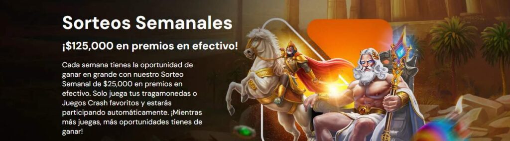 Cada semana hay $25,000 en premios en efectivo, y tú puedes formar parte del pozo simplemente jugando tus slots o juegos Crash favoritos. Nada de formularios ni pasos complicados: juegas y automáticamente participas.