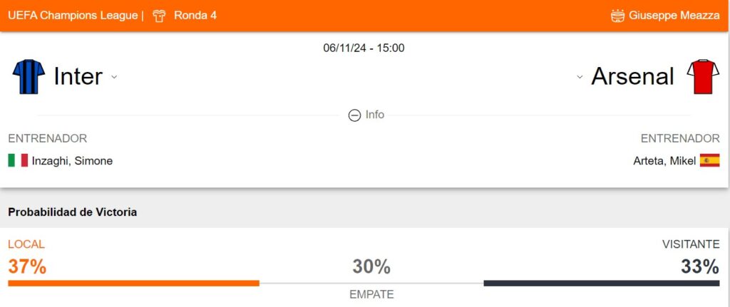 - El historial de 3 partidos entre estos equipos, que se dividen en 1 victoria para el Inter y 2 triunfos para el Arsenal.
