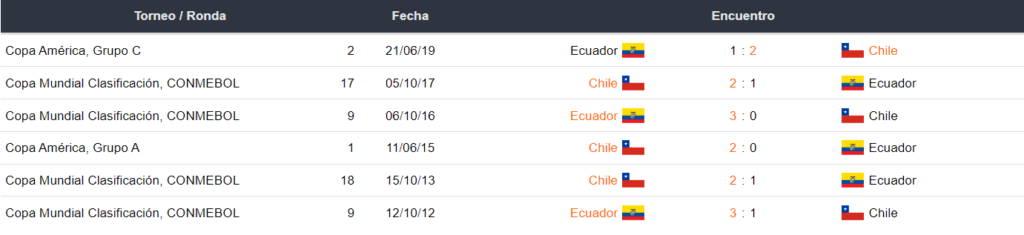 Betsson Ecuador te muestra los últimos partidos entre estas selecciones, en la cual podemos notar una ventaja de la selección chilena. Esta ha ganado 4 de los 6 partidos y ha perdido 2 juegos antes Ecuador.