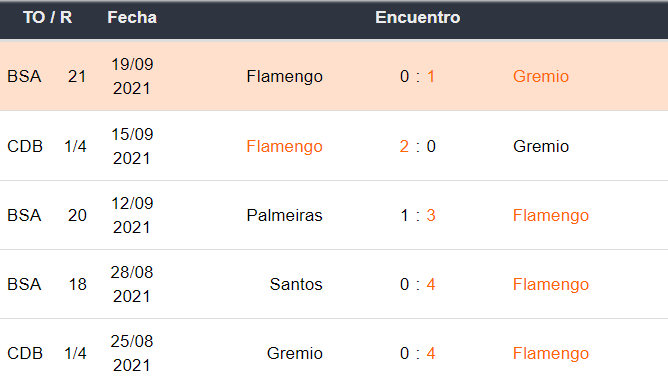 Se puede denotar un amplio dominio del Flamengo, que ha ganado los 2 partidos que han disputados ambos equipos. Entre los 2 juegos ha anotado 5 goles y tan solo ha recibido 1.