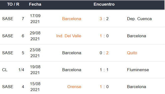 En los últimos 5 partidos el equipo del Barcelona lleva 3 derrotas 1 empate y tan sola una victoria. Ha perdido puntos importantes en la liga que lo han llevado a perder posiciones en la competencia